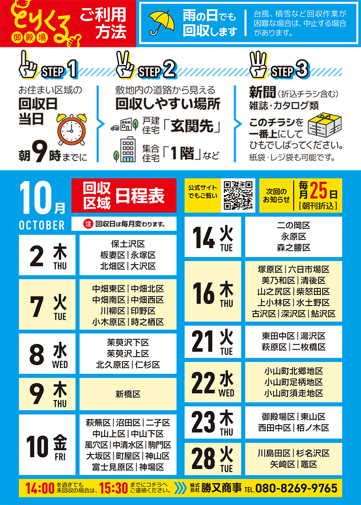『トリクル御殿場』は古新聞(チラシ込み)と一緒に雑誌・カタログ類を毎月回収する新聞ご購読者様限定無料サービスです。ご登録されたお客様のご自宅前まで月に1度回収にうかがいます。(回収日は毎月変わります)R7年10月分の回収予定表を以下からご確認ください。